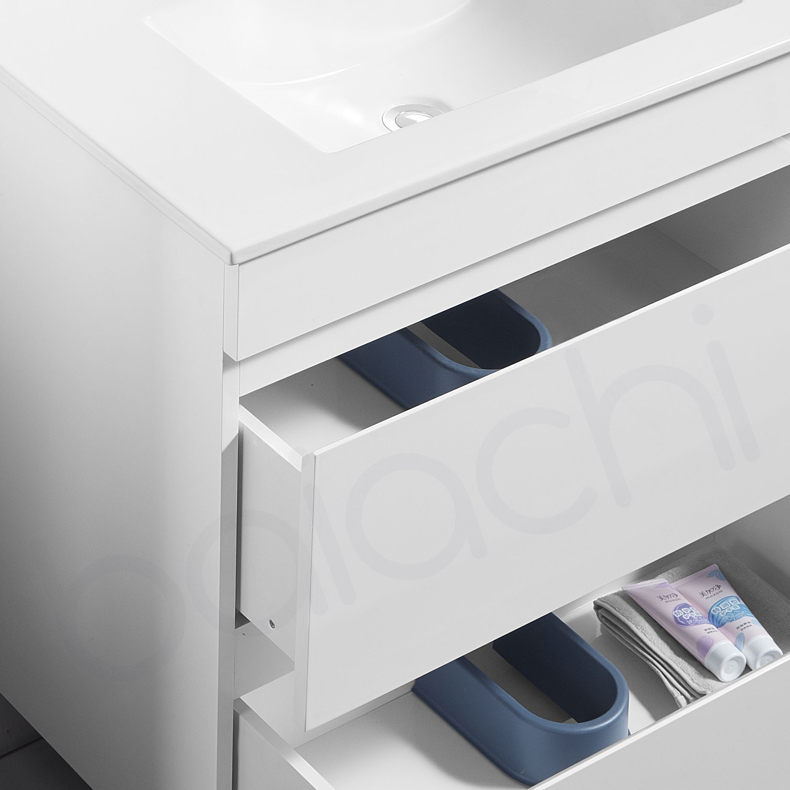 The Vellena PVC Waterproof Bathroom Vanity is designed to last, featuring DTC undermount drawer system and solid drawer base for enhanced durability. The reinforced back with metal brackets adds extra support and stability, making it a sturdy and reliable choice for your bathroom.
